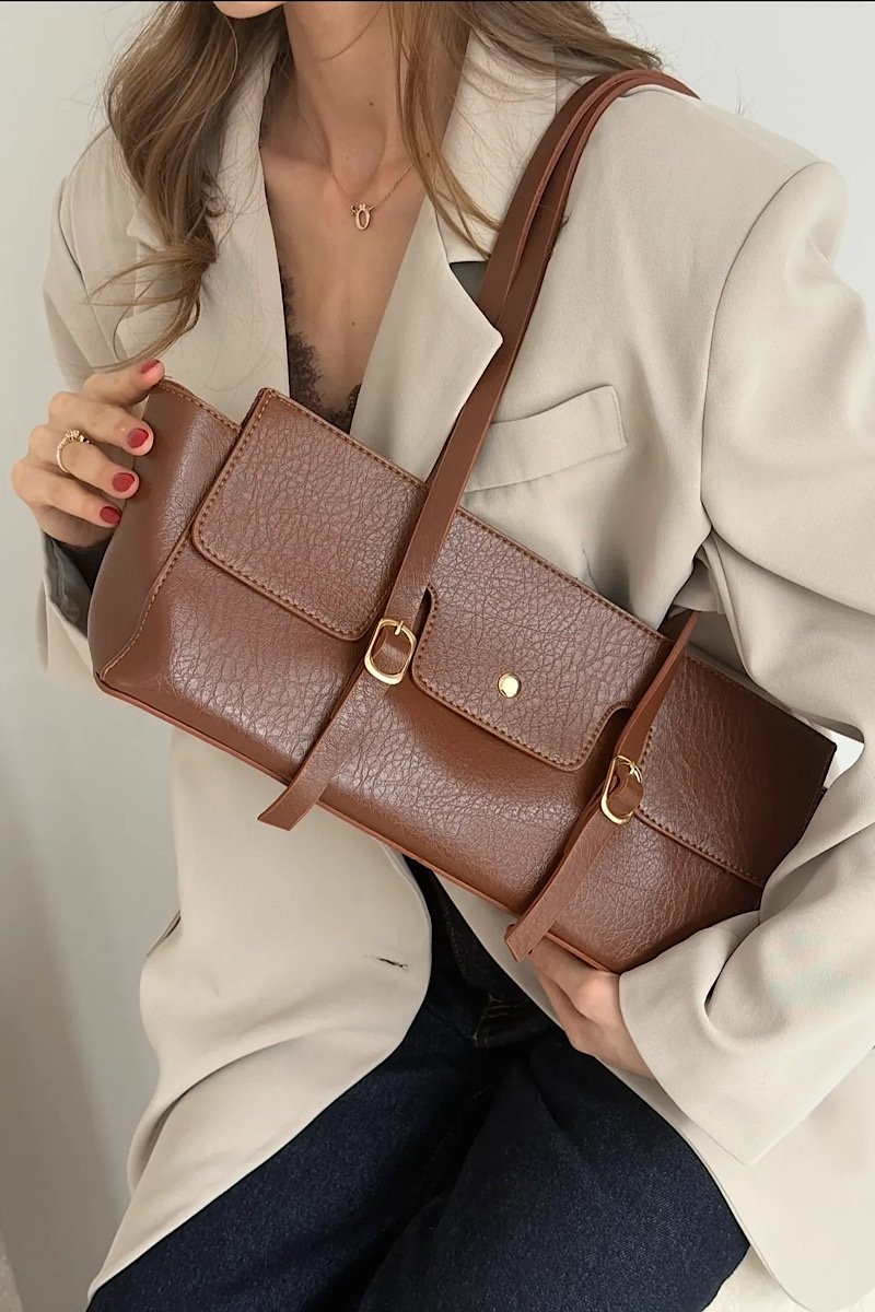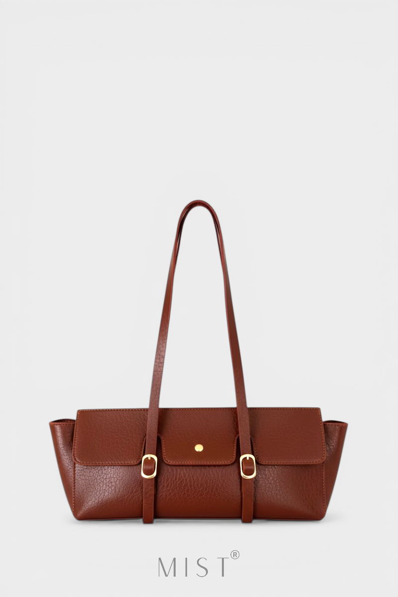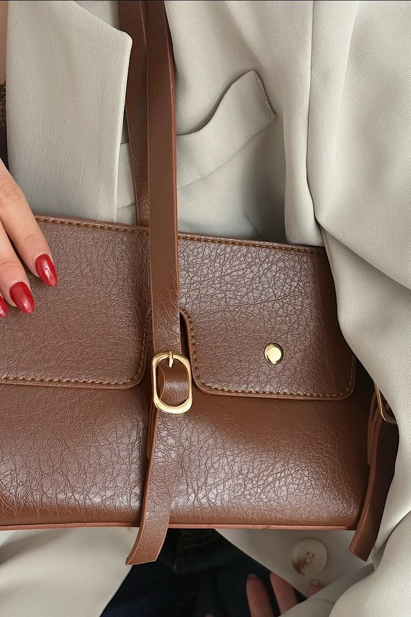 It is made of first-quality soft-textured vegan leather. The metal accessories are gold colored.